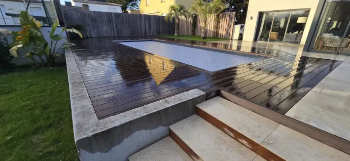 Nous réalisons les finitions (dallages, margelles, terrasse bois, végétalisation, éclairage) pour un rendu cohérent, élégant et durable.